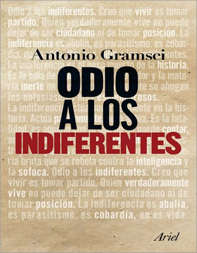 Odio a los indiferentes. Creo, como Friedrich Hebbel, que «vivir significa tomar partido». No pueden existir quienes sean solamente hombres, extraños a la ciudad. Quien realmente vive no puede no ser ciudadano, no tomar partido. La indiferencia es apatía, es parasitismo, es cobardía, no es vida. Por eso odio a los indiferentes.