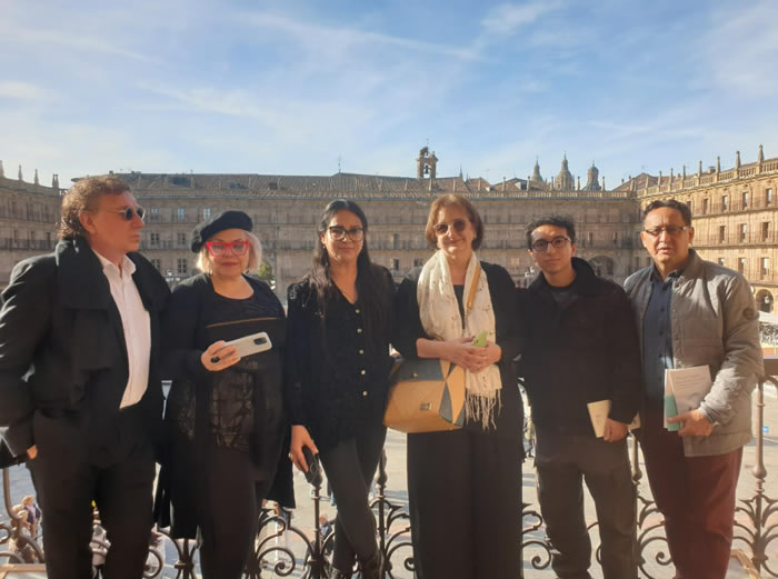 Finalizada la sesión matutina, los participantes posaron para la tradicional fotografía colectiva ante la icónica fachada de la Universidad de Salamanca. Bajo el sol otoñal, los poetas se alinearon, envueltos en una brisa de hermandad, y daba la impresión que los relieves de esa fachada susurraban versos de Fray Luis de León o de Antonio de Nebrija. El clic de las cámaras congeló un mosaico humano: rostros, gestos, sonrisas y miradas que se cruzaban como hilos de un tapiz trasatlántico. Y así, como el Tormes fluye sin detenerse, el encuentro se desplegó en una sinfonía de versos que tejieron un lienzo inolvidable. Desde la Hospedería Arzobispo Fonseca, los poetas caminaban en grupo hacia los escenarios donde la palabra cobraba vida. Cada jornada constituía un nuevo capítulo: no lineal, sino de naturaleza circular, similar a un abrazo que reúne diversas nacionalidades.