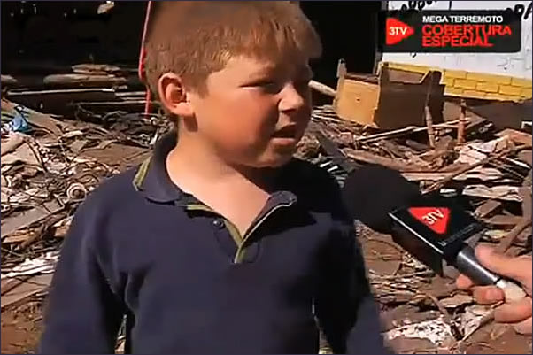 José Miguel Viñuela y Felipe Camiroaga y Lucho Jara y que sé yo qué otros pejesapos, nadie se ha abstenido de pegarle unos mordiscos al niño de Iloca. Unos quieren que diga algo chispeante, otros que se muestre emotivo y llore, la mayoría que les permita participar en el campeonato de caras penosas. Cómo será este festival encarnizado, que hasta el Presidente lo escogió como emblema de la reconstrucción. Y, para colmo, ahora no hay un solo gallipavo solidario que pase por Iloca sin ir a ver al san Zafrada y fotografiarse con él.