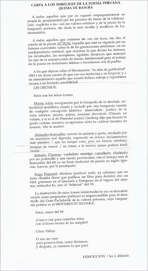 A continuación, compartimos algunos extractos (separados por tres imágenes y dos documentos del grupo Kloaka, enviados por el mismo Mazzotti, cuando preparábamos una edición previa, por ahora interrumpida) de nuestro vital diálogo con el poeta y académico. En una época de agresivo neoliberalismo, con visos fascistas reciclados, y aun de múltiples acomodamientos —tan previsibles como tardíos—, no es común ni sencillo sostener una posición divergente en los terrenos de la cultura y la política. Menos todavía desde aquellos años de la violencia política en el Perú hasta la actualidad. En tal sentido, no es solo un testimonio personal, sino que adquiere un carácter generacional y de época.