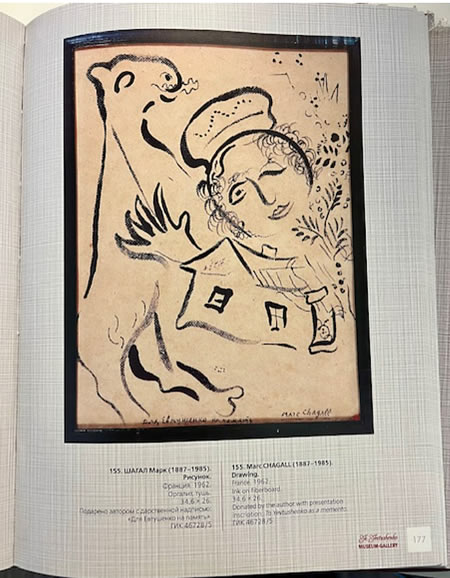 Yevtushenko nunca recuperó ni el catálogo ni la carta de Chagall. Hasta el día de hoy, ninguno de los dos ha sido encontrado. Ese mismo día en París, mientras conversaban en el estudio de Chagall, este hizo un dibujo para Yevtushenko. Como se puede leer en la inscripción al pie, Chagall completó el dibujo en unos diez minutos, según Yevtushenko. Hoy, ese dibujo se conserva en el Museo Yevtushenko en Peredelkino, cerca de Moscú. Está al lado, a cinco minutos de su casa en esa ciudad. Cuando fui a Rusia invitado por él a algunas lecturas de poesía me quedé en su casa por una semana y después me fui a Samara en tren.