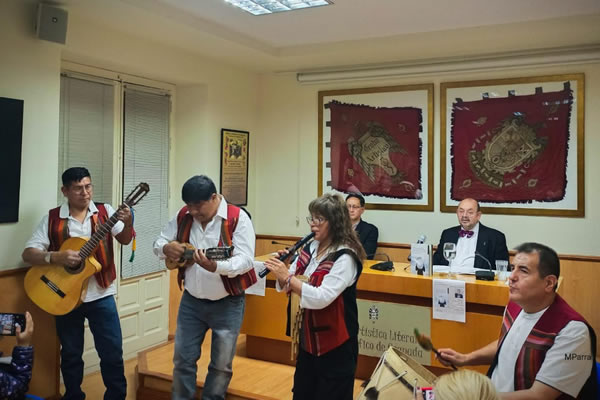 El componente musical enriqueció notablemente la velada. El grupo Raíz Andina, con instrumentos tradicionales como guitarra, charango, zampoña, quena y bombo, interpretó algunas piezas bolivianas que trasladaron por momentos al público, al Altiplano boliviano. El instante más emotivo llegó con la interpretación de la cueca «Adiós Oruro del alma», una canción de despedida para los soldados orureños que partían a la Guerra del Chaco (1932-1935) entre Bolivia y Paraguay. Esta canción que condensa profundo valor histórico y emocional, hizo volar mi fantasía a la tierra que me vio nacer, en la que di mis primeros pasos en la vida. Cada nota abría una puerta al pasado: familiares, amistades, vecinos, carnavales, voces queridas, tardes que parecían eternas, etc. Por un instante, el tiempo se rindió y comprendí que hay melodías que no solo se escuchan, sino que, de alguna manera, nos regresan a nuestra infancia y juventud.