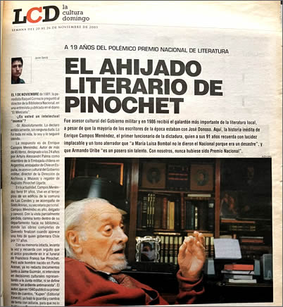 En 1986 la dictadura le dio varios obsequios a Campos Menéndez. Primero fue llamado a ocupar el cargo de embajador de Chile en España. Meses después, en agosto, le entregaría nada menos que el Premio Nacional de Literatura. Ese año, el autor indiscutido para obtener el galardón era José Donoso, por entonces traducido a más de veinte idiomas, cuya obra circulaba entre las y los lectores del continente.