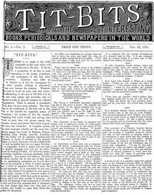 Titbits fue una publicación en formato de periódico que reunía artículos de diversas fuentes, reescritos en versiones breves y accesibles. También incluía relatos originales. Con el paso del tiempo, el medio fue modificando su formato y estilo y, hacia los años sesenta, terminó convirtiéndose en una revista de carácter erótico.