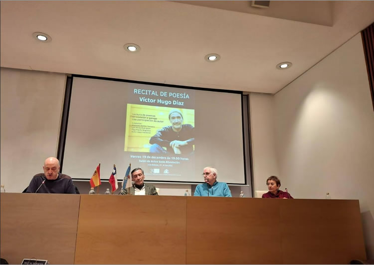 El recital en La Coruña consistió en la lectura de los textos originales de Víctor Hugo Díaz en español y, posteriormente, la versión en gallego, realizada por Edmundo Moure, en las voces de Alejandra Bellón Tenreiro, Luis Pérez, Patiño Nogueira y este cronista. La mayoría de los poemas pertenecían al libro “El suelo Pesa” (Editorial Cuarto Propio, Santiago de Chile, 2023, 57 pág.), donde aparecen las líneas que definen la poesía de Díaz, en constante tensión entre la denuncia social y la exploración formalista.