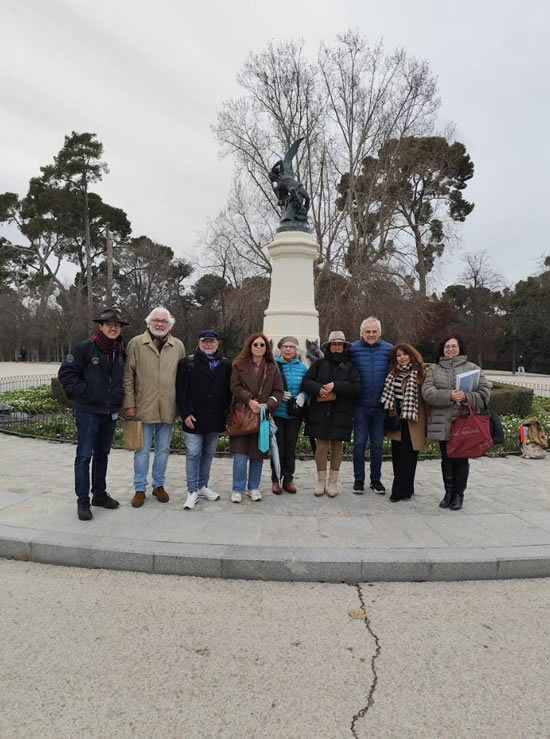 A continuación, la lluvia y el frío no fueron impedimento para realizar un recorrido literario por el parque madrileño de El Retiro, en compañía del grupo poético de Aranjuez, “Poetas en el paisaje”, y en este escenario abierto, con el paraguas de telón, Montserrat Doucet, Ángel de Marco, Juani Martínez, Aurelio Campos y Ángel Justo Cámara, compartieron sus versos con los integrantes del Encuentro, venidos desde distintos puntos de España y América.